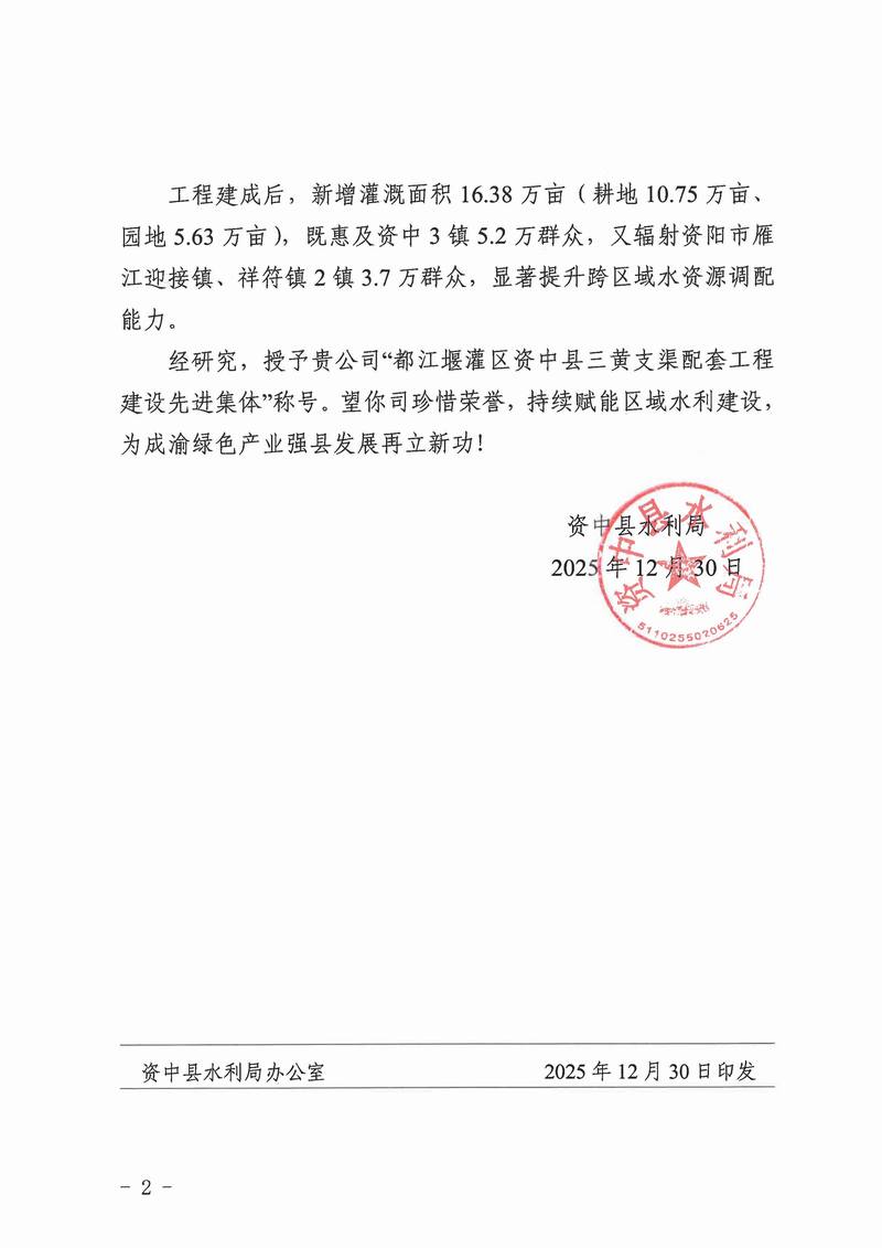 近日,公司都江堰灌區資中縣三黃支渠配套工程項目經理部(以下簡稱“項目部”)榮獲資中縣水利局授予的“都江堰灌區資中縣三黃支渠配套工程建設先進集體”稱號。